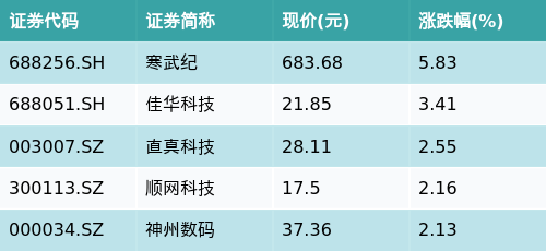 截至早盘收盘,东数西算主题涨跌幅最高的五只股票为:寒武纪(688256.SH)、佳华科技(688051.SH)、直真科技(003007.SZ)、顺网科技(300113.SZ)与神州数码(000034.SZ)。详情见下表: