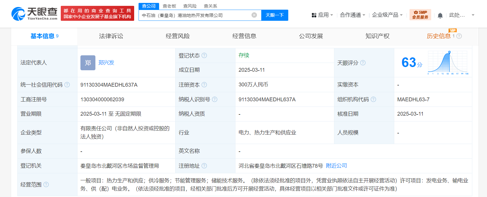 南方财经3月13日电,天眼查App显示,近日,中石油(秦皇岛)港油地热开发有限公司成立,法定代表人为郑兴发,注册资本300万人民币,经营范围含热力生产和供应,供冷服务,节能管理服务,储能技术服务,发电业务、输电业务、供(配)电业务。股东信息显示,该公司由中国石油(601857)旗下中石油太湖(北京)投资有限公司全资持股。