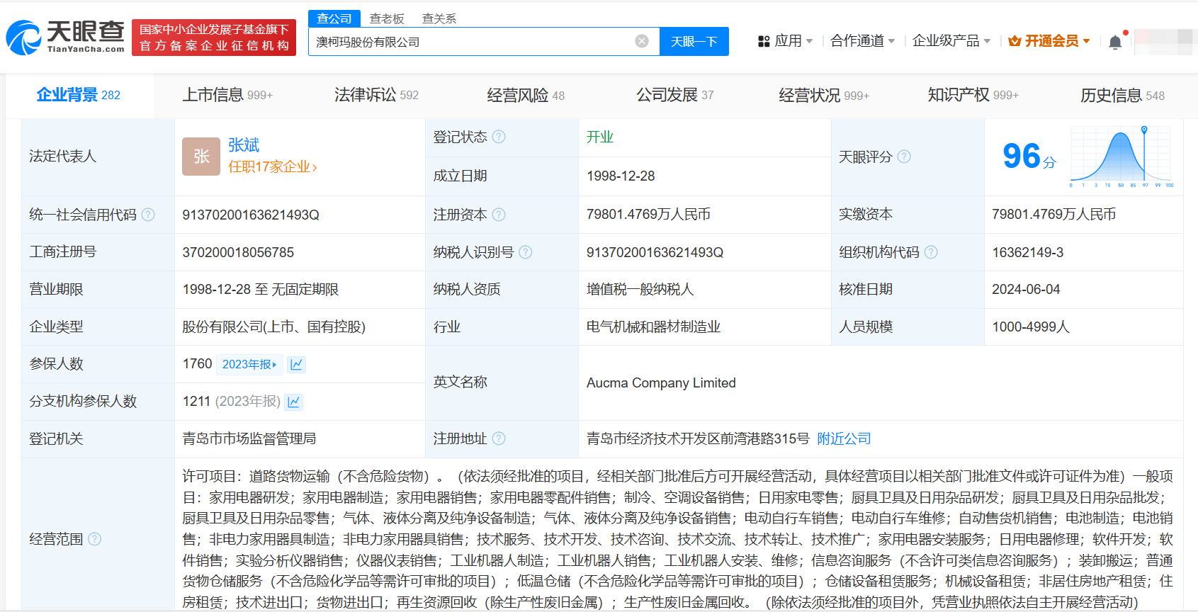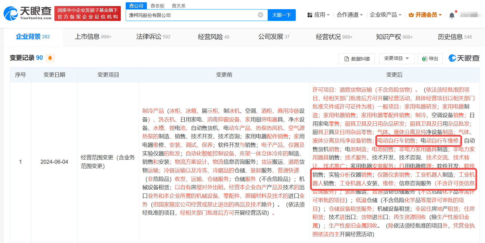 南方财经6月6日电,天眼查App显示,近日,澳柯玛(600336)发生工商变更,经营范围新增工业机器人制造,工业机器人销售,工业机器人安装、维修,电动自行车销售,电动自行车维修等。澳柯玛股份有限公司成立于1998年12月,法定代表人为张斌,注册资本约7.98亿人民币,由青岛澳柯玛控股集团有限公司、青岛市企业发展投资有限公司、青岛城投城金控股集团有限公司等共同持股。