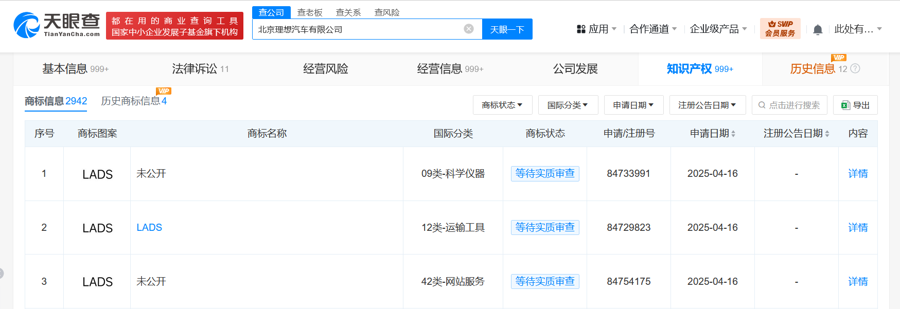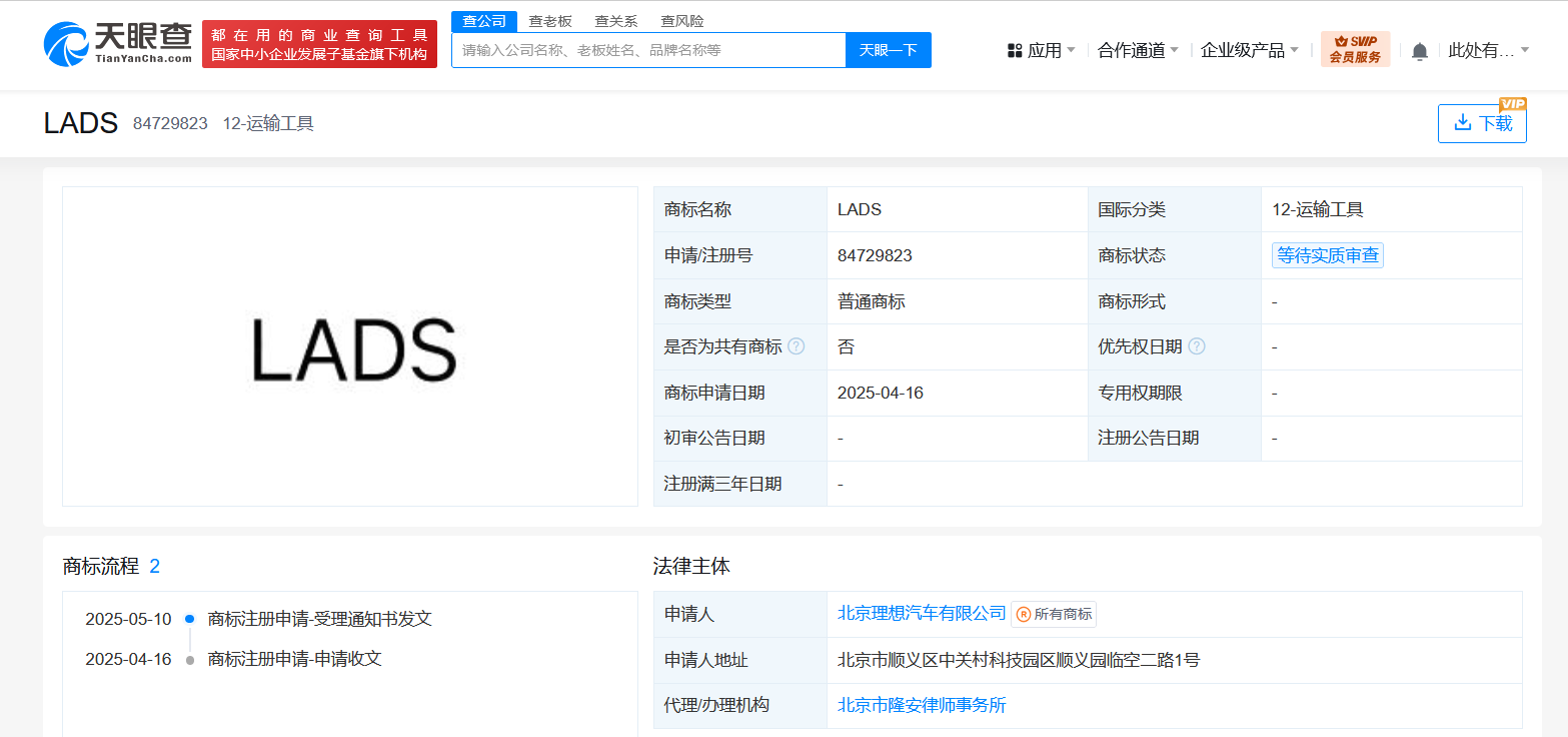 理想汽车申请注册LADS商标
