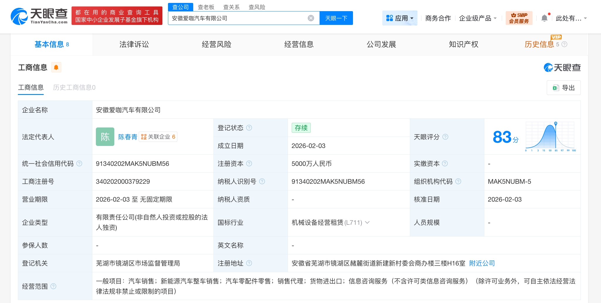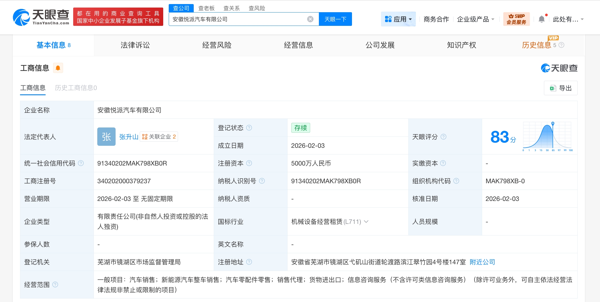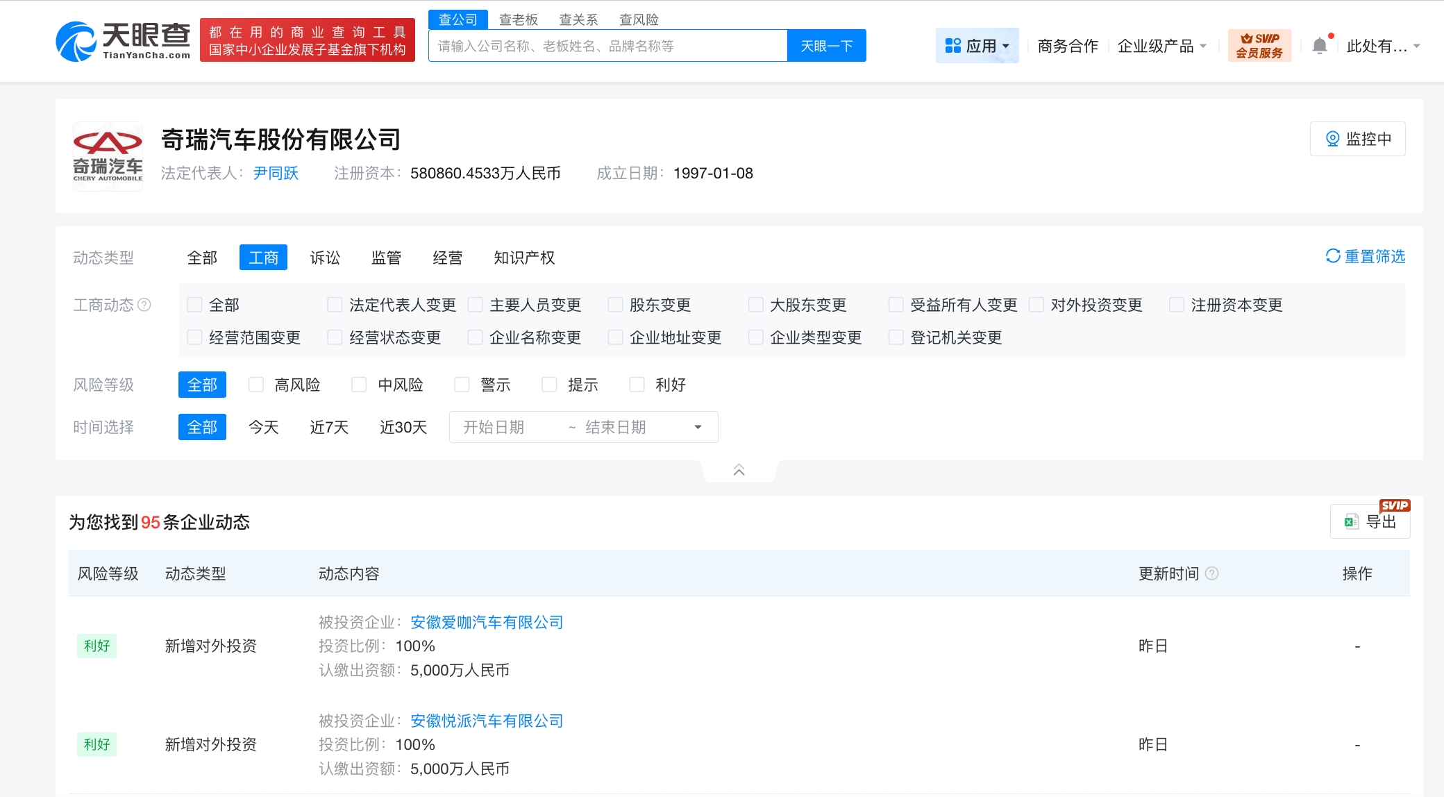 南方财经2月9日电,天眼查工商信息显示,2月3日,安徽悦派汽车有限公司、安徽爱咖汽车有限公司成立,法定代表人分别为张升山、陈春青,注册资本均为5000万人民币,经营范围均为汽车销售、新能源汽车整车销售、汽车零配件零售、销售代理、货物进出口、信息咨询服务。股东信息显示,上述两公司均由奇瑞汽车股份有限公司全资持股。