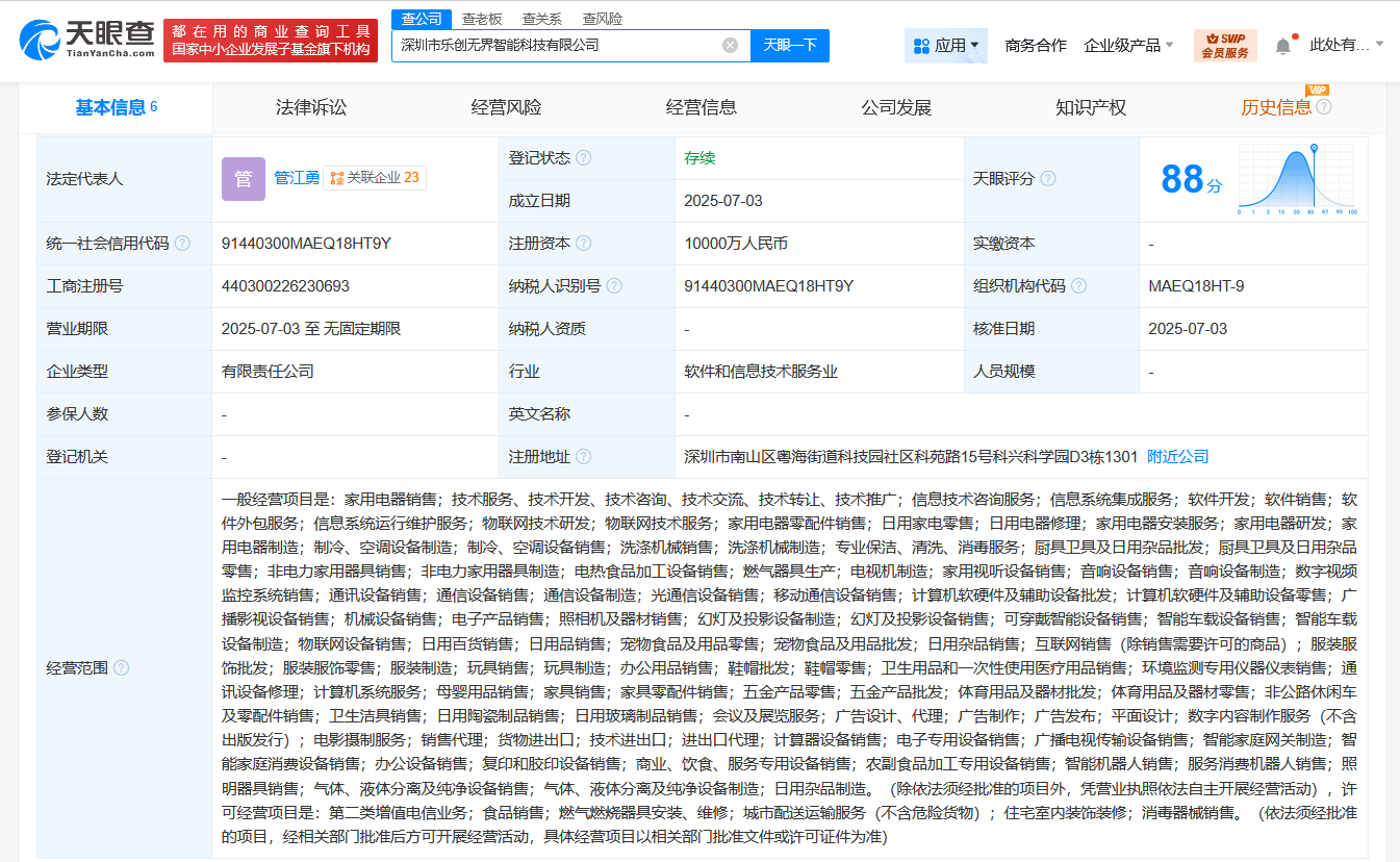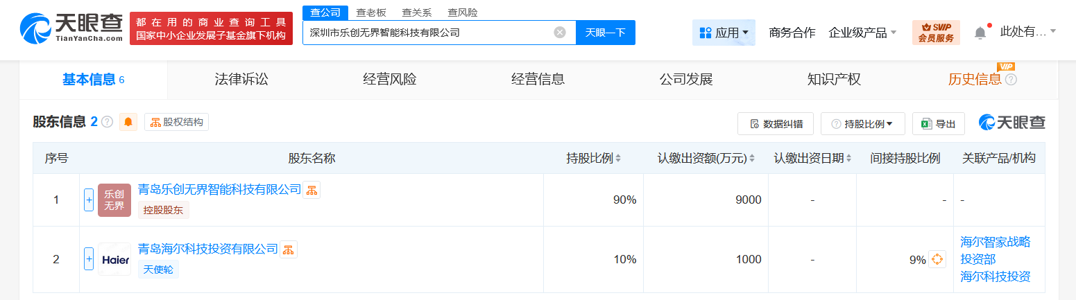 南方财经7月3日电,天眼查App显示,近日,深圳市乐创无界智能科技有限公司成立,法定代表人为管江勇,注册资本1亿人民币,经营范围含家用电器销售、信息技术咨询服务、信息系统集成服务、信息系统运行维护服务、物联网技术研发、物联网技术服务、家用电器零配件销售等。股东信息显示,该公司由海尔智家(600690)旗下青岛乐创无界智能科技有限公司、青岛海尔科技投资有限公司共同持股。
