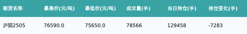南财智讯4月15日电,南财金融终端盘后期货数据显示,上海期货交易所的沪铜主力合约收涨0.16%,收盘报75970.0元/吨,日内资金流出6.0亿元。其他相关指标见下表: