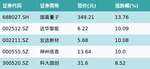 截至午间收盘,量子科技主题涨跌幅最高的五只股票为:国盾量子(688027.SH)、达华智能(002512.SZ)、宏达新材(002211.SZ)、神州信息(000555.SZ)与科大国创(300520.SZ)。详情见下表: