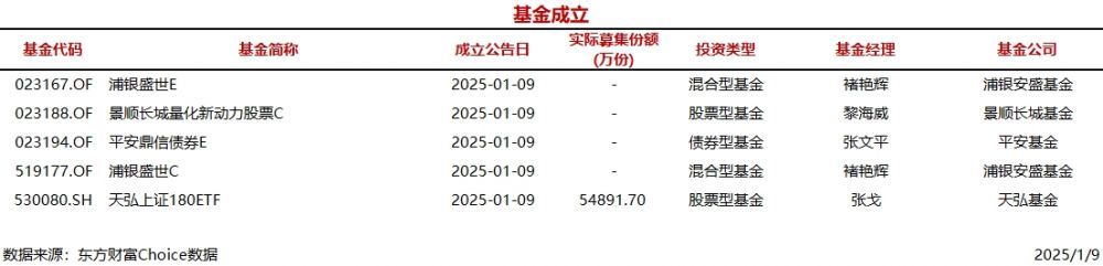 南方财经1月9日电,据东方财富Choice数据统计,今日共有5只基金公告成立(A/C类分开计算),包括2只混合型基金、2只股票型基金、1只债券型基金。
