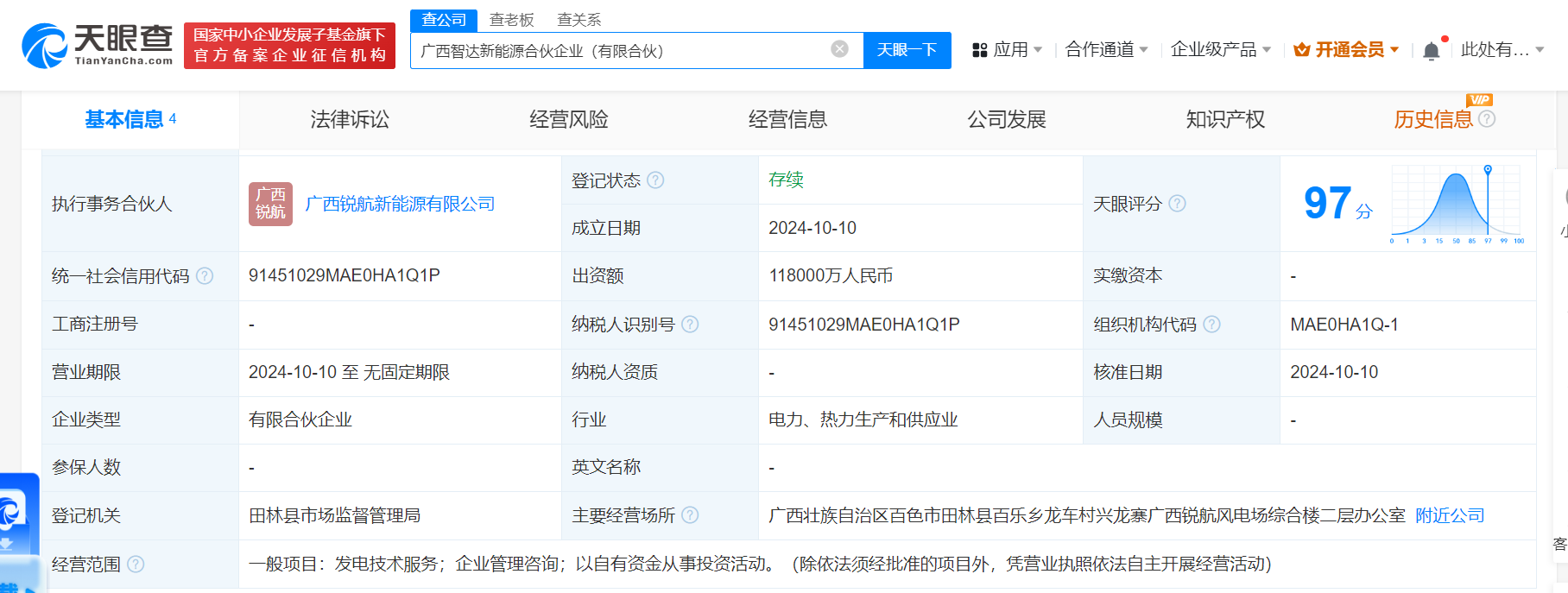南方财经10月11日电,天眼查App显示,近日,广西智达新能源合伙企业(有限合伙)成立,执行事务合伙人为广西锐航新能源有限公司,出资额11.8亿人民币,经营范围为发电技术服务、企业管理咨询、以自有资金从事投资活动。合伙人信息显示,该企业由国家电投旗下广西国电投海桂新能源有限公司、广西锐航新能源有限公司、国家电投集团海南电力有限公司共同出资。