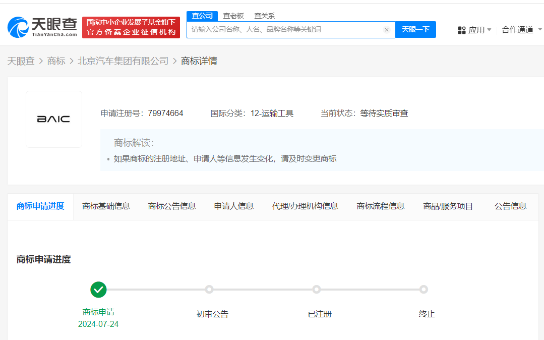 南方财经9月24日电,据媒体报道,近日,北汽集团旗下北京汽车发布公告,称公司标志已变更,新标志改为BAIC的字母车标,其中B/A两个字母有特殊的设计,老款标志将不再使用。天眼查知识产权信息显示,北京汽车集团有限公司已于今年7月申请注册2枚“BAIC”图形商标,国际分类为运输工具、建筑修理,当前商标状态均为等待实质审查。