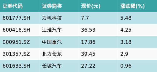 截至收盘,汽车整车主题涨跌幅最高的五只股票为:力帆科技(601777.SH)、江淮汽车(600418.SH)、中国重汽(000951.SZ)、北方长龙(301357.SZ)与长城汽车(601633.SH)。详情见下表:
