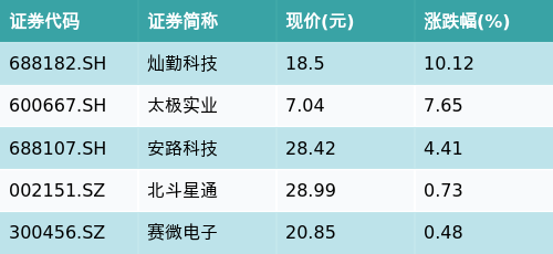 截至收盘,国家大基金持股主题涨跌幅最高的五只股票为:灿勤科技(688182.SH)、太极实业(600667.SH)、安路科技(688107.SH)、北斗星通(002151.SZ)与赛微电子(300456.SZ)。详情见下表: