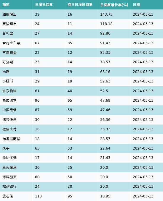 黑猫投诉:猫眼演出、天猫超市和合利宝3月13日投诉回复增速最高