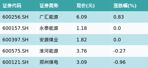 截至收盘,动力煤主题涨跌幅最高的五只股票为:广汇能源(600256.SH)、永泰能源(600157.SH)、安源煤业(600397.SH)、淮河能源(600575.SH)与郑州煤电(600121.SH)。详情见下表: