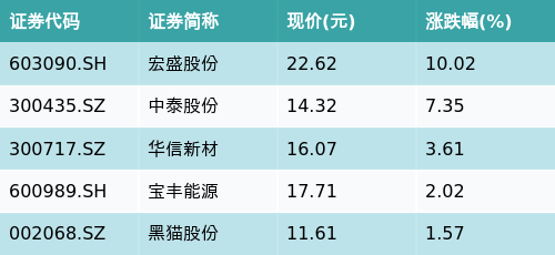 截至收盘,煤化工主题涨跌幅最高的五只股票为:宏盛股份(603090.SH)、中泰股份(300435.SZ)、华信新材(300717.SZ)、宝丰能源(600989.SH)与黑猫股份(002068.SZ)。详情见下表: