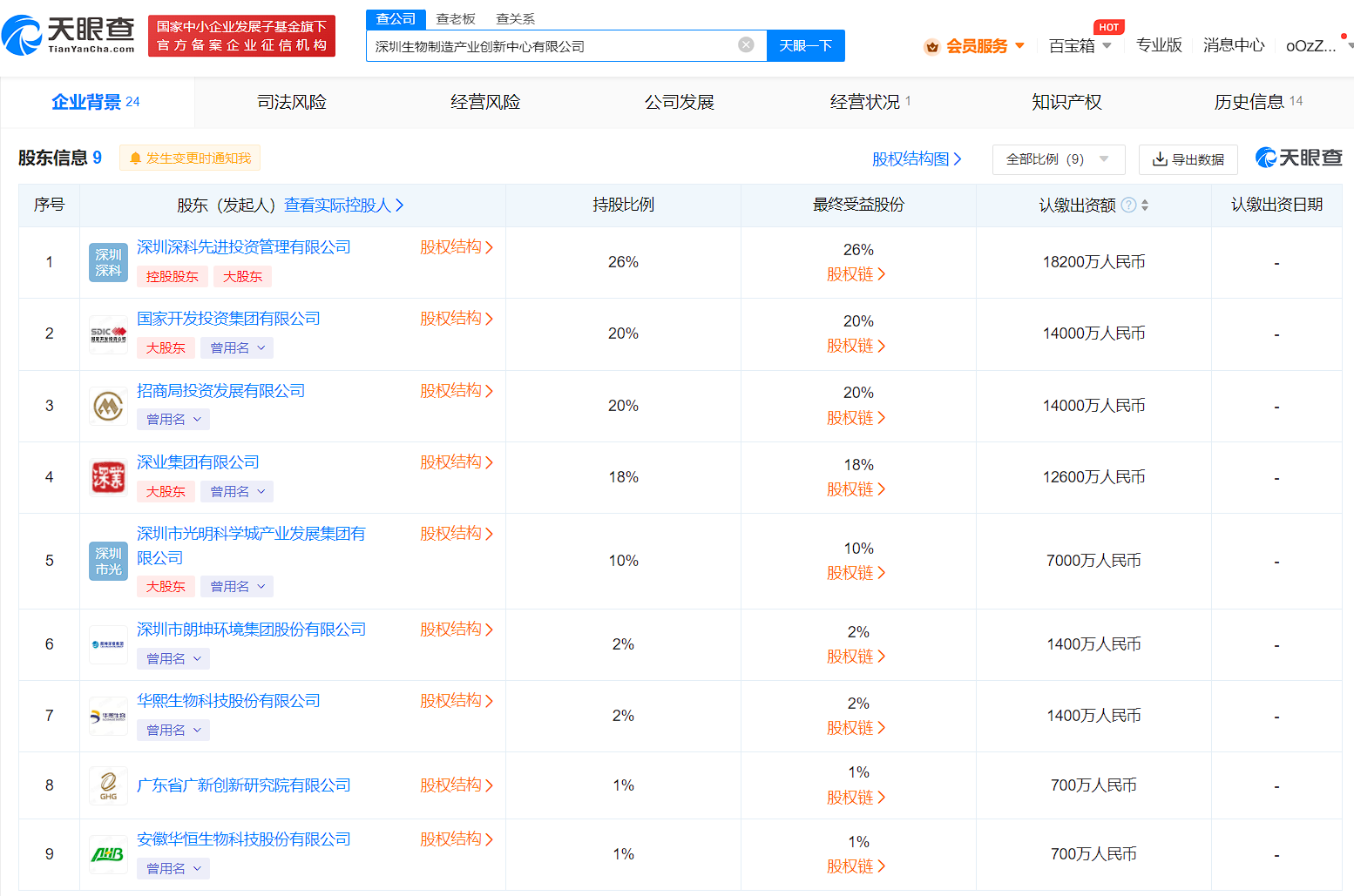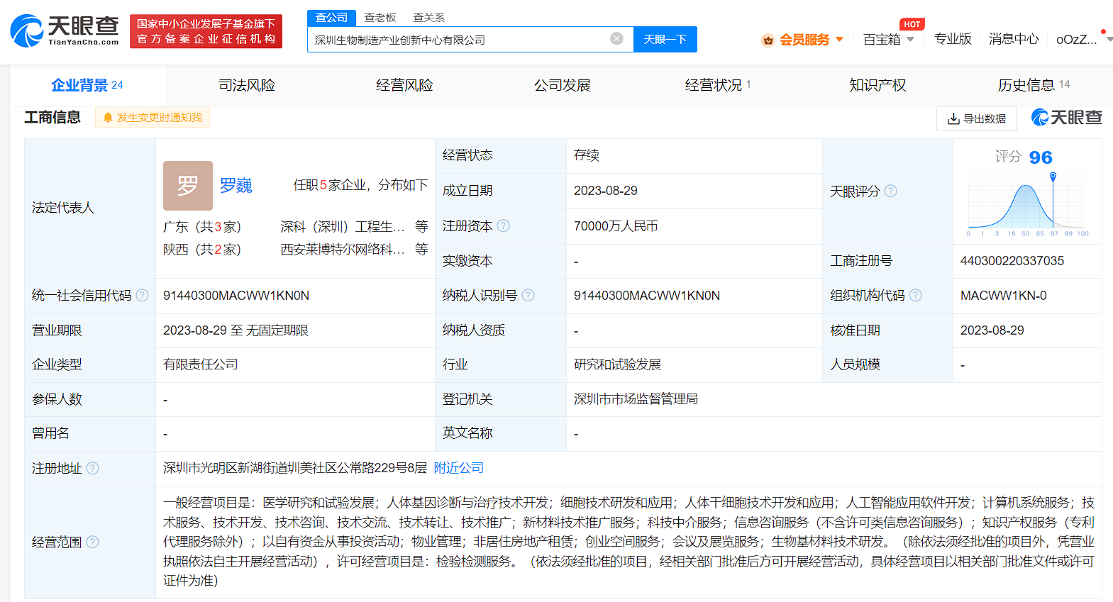南方财经9月1日电,天眼查App显示,近日,深圳生物制造产业创新中心有限公司成立,法定代表人为罗巍,注册资本7亿人民币,经营范围含医学研究和试验发展、人体基因诊断与治疗技术开发、细胞技术研发和应用、新材料技术推广服务、人工智能应用软件开发、生物基材料技术研发等。股东信息显示,该公司由深圳深科先进投资管理有限公司、国家开发投资集团有限公司、招商局投资发展有限公司、深业集团有限公司、华熙生物(688363)、朗坤环境(301305)等共同持股。
