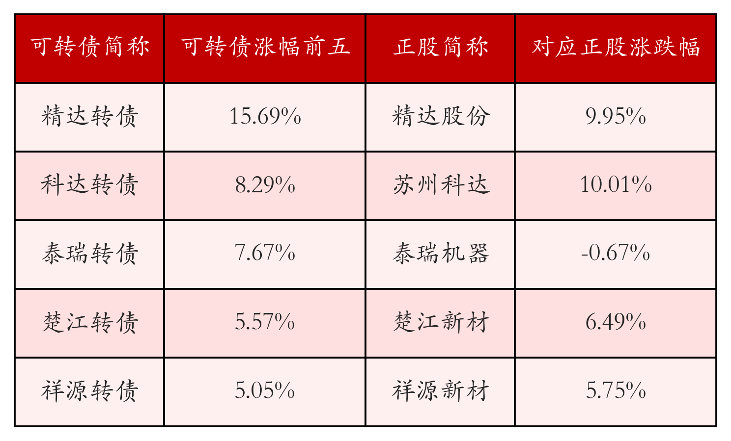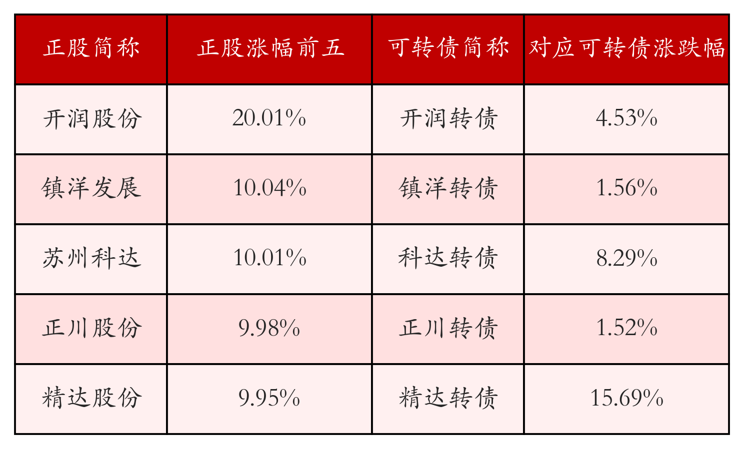 存在交易量的可转债所对应的正股中,231只收涨,13只收平,284只收跌。具体来看,15只可转债对应正股涨幅超过5%,其中,开润股份(300577)涨停,收涨20.01%; 镇洋发展(603213)涨停,收涨10.04%; 苏州科达(603660)涨停,收涨10.01%。同时所对应的可转债:开润转债(123039)同涨4.53%; 镇洋转债(113681)同涨1.56%; 科达转债(113569)同涨8.29%。
