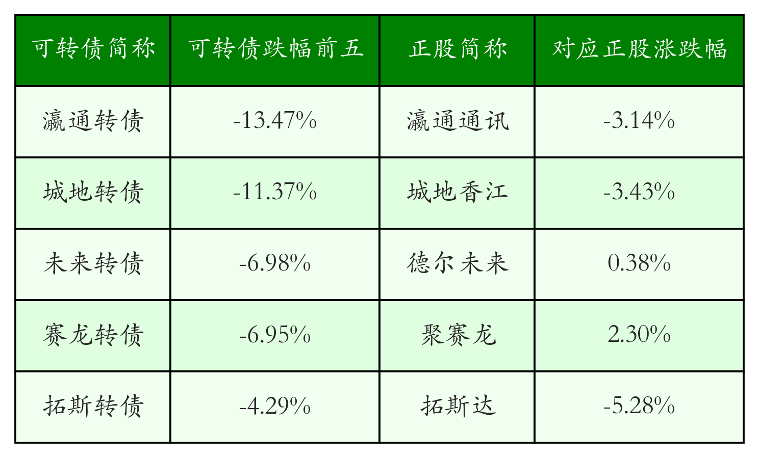 今日有15只可转债跌幅超2%,瀛通转债 (128118)跌13.47%,城地转债 (113596)跌11.37%,未来转债 (128063)跌6.98%。