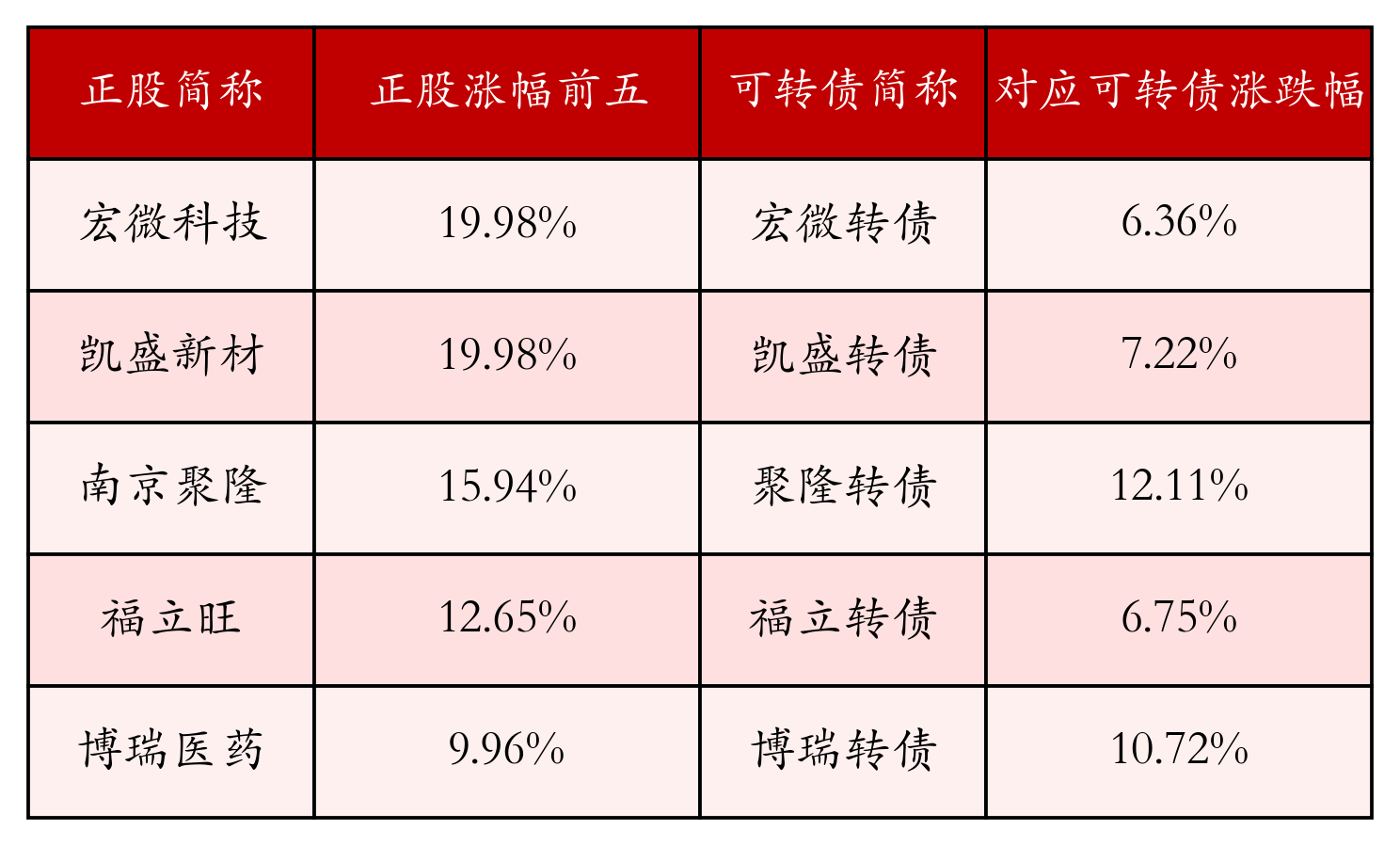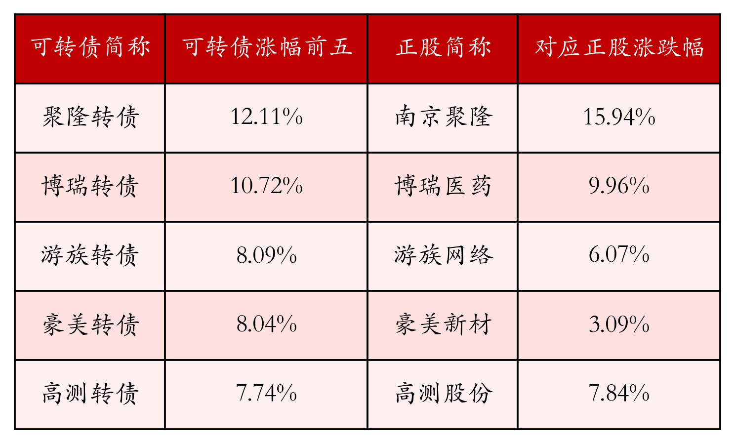 南财智讯8月6日电,南财金融终端盘后数据显示,债市方面,中证转债指数收涨0.58%,报467.84,成交额为874.89亿元。可转债方面,今日共成交458只可转债,其中380只收涨,3只收平,75只收跌。具体来看,53只可转债涨幅超过2%。其中聚隆转债(123209)涨12.11%,博瑞转债(118004)涨10.72%,游族转债(128074)涨8.09%。今日有8只可转债跌幅超2%,天路转债(110060)跌14.54%,东杰转债(123162)跌12.05%,奇正转债(128133)跌4.97%。存在交易量的可转债所对应的正股中,285只收涨,22只收平,151只收跌。具体来看,22只可转债对应正股涨幅超过5%,其中,宏微科技(688711)涨停,收涨19.98%;凯盛新材(301069)涨停,收涨19.98%。同时所对应的可转债:宏微转债(118040)同涨6.36%;凯盛转债(123233)同涨7.22%。今日有7只可转债对应正股跌幅超过5%,西藏天路(600326)跌停,收跌10.01%。同时所对应的可转债:天路转债(110060)同跌14.54%。