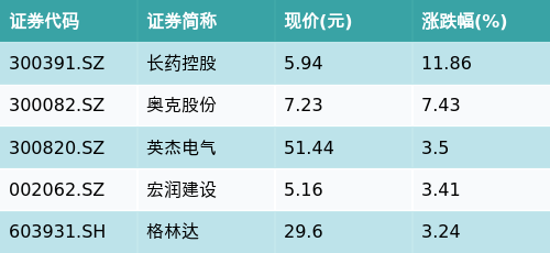 截至收盘,太阳能主题涨跌幅最高的五只股票为:长药控股(300391.SZ)、奥克股份(300082.SZ)、英杰电气(300820.SZ)、宏润建设(002062.SZ)与格林达(603931.SH)。详情见下表: