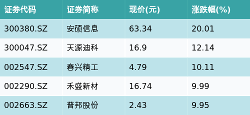 截至收盘,互联网金融主题涨跌幅最高的五只股票为:安硕信息(300380.SZ)、天源迪科(300047.SZ)、春兴精工(002547.SZ)、禾盛新材(002290.SZ)与普邦股份(002663.SZ)。详情见下表: