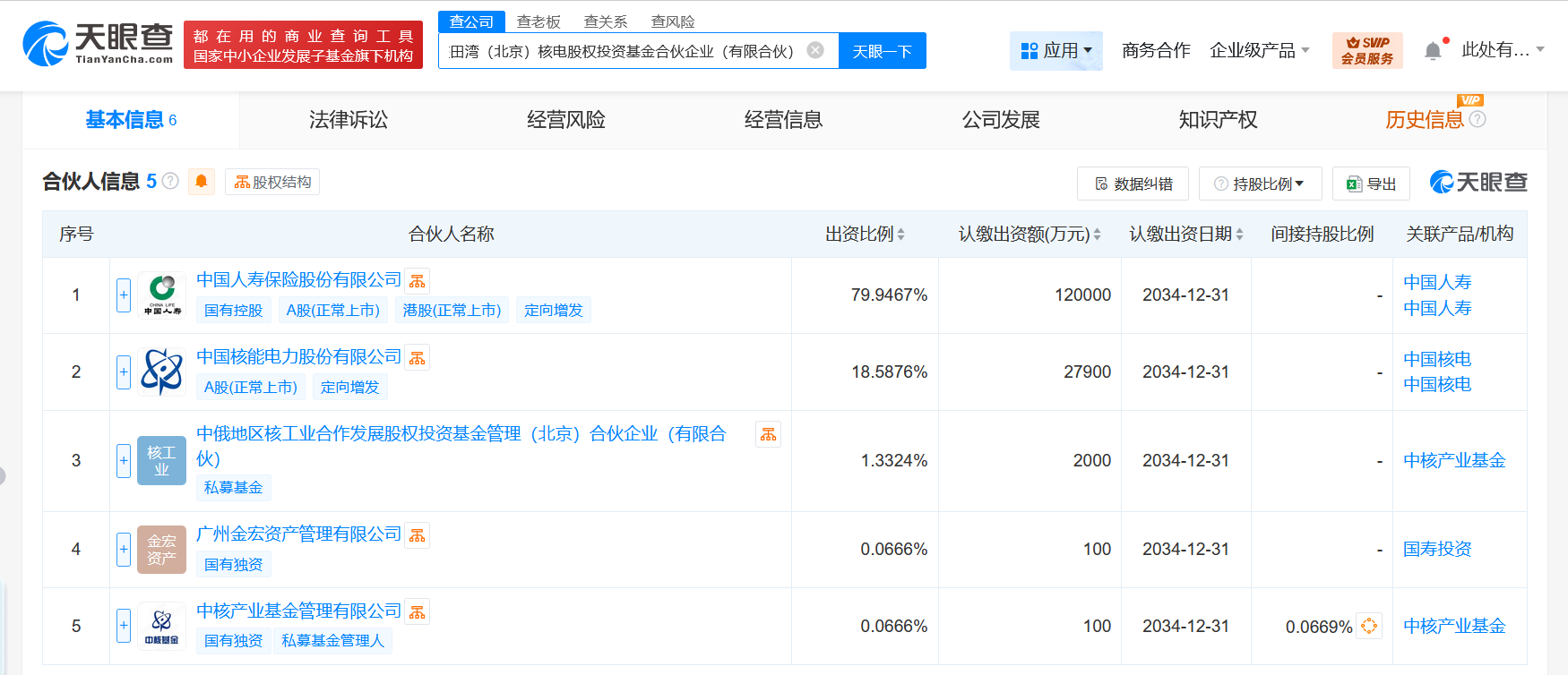 南方财经7月1日电,天眼查App显示,近日,中核田湾(北京)核电股权投资基金合伙企业(有限合伙)成立,执行事务合伙人为中核产业基金管理有限公司、广州金宏资产管理有限公司,出资额15.01亿人民币,经营范围含私募股权投资基金管理、创业投资基金管理服务,以私募基金从事股权投资、投资管理、资产管理等活动。合伙人信息显示,该基金由中国人寿(601628)、中国核电(601985)、中俄地区核工业合作发展股权投资基金管理(北京)合伙企业(有限合伙)、广州金宏资产管理有限公司、中核产业基金管理有限公司共同出资。据媒体报道,6月26日,中国人寿发布公告,宣布与合作伙伴共同成立合伙企业,拟对以“核电项目开发、投资、建设、运营”为经营范围的中国境内核电企业进行股权投资,助力中国清洁低碳能源发展。