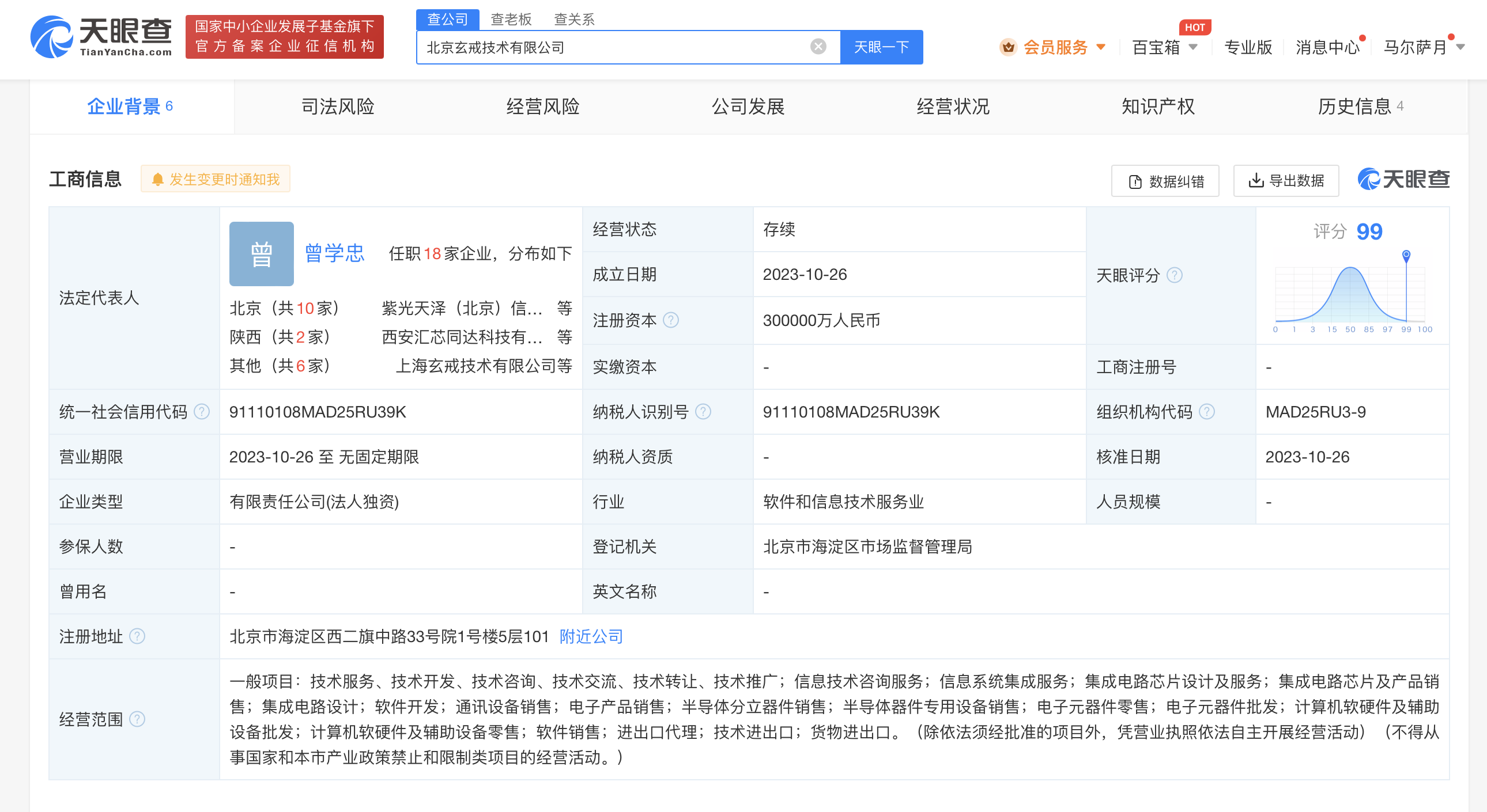 南方财经10月31日电,天眼查App显示,近日,北京玄戒技术有限公司成立,法定代表人为曾学忠,注册资本30亿人民币,经营范围含技术服务、集成电路芯片设计及服务、半导体分立器件销售、电子元器件批发、技术进出口等。股东信息显示,该公司由小米旗下北京玄戒信息科技有限公司全资持股。值得一提的是,北京玄戒信息科技有限公司也于不久前刚刚成立,其注册资本同为30亿人民币,由X-Ring Limited间接全资持股。