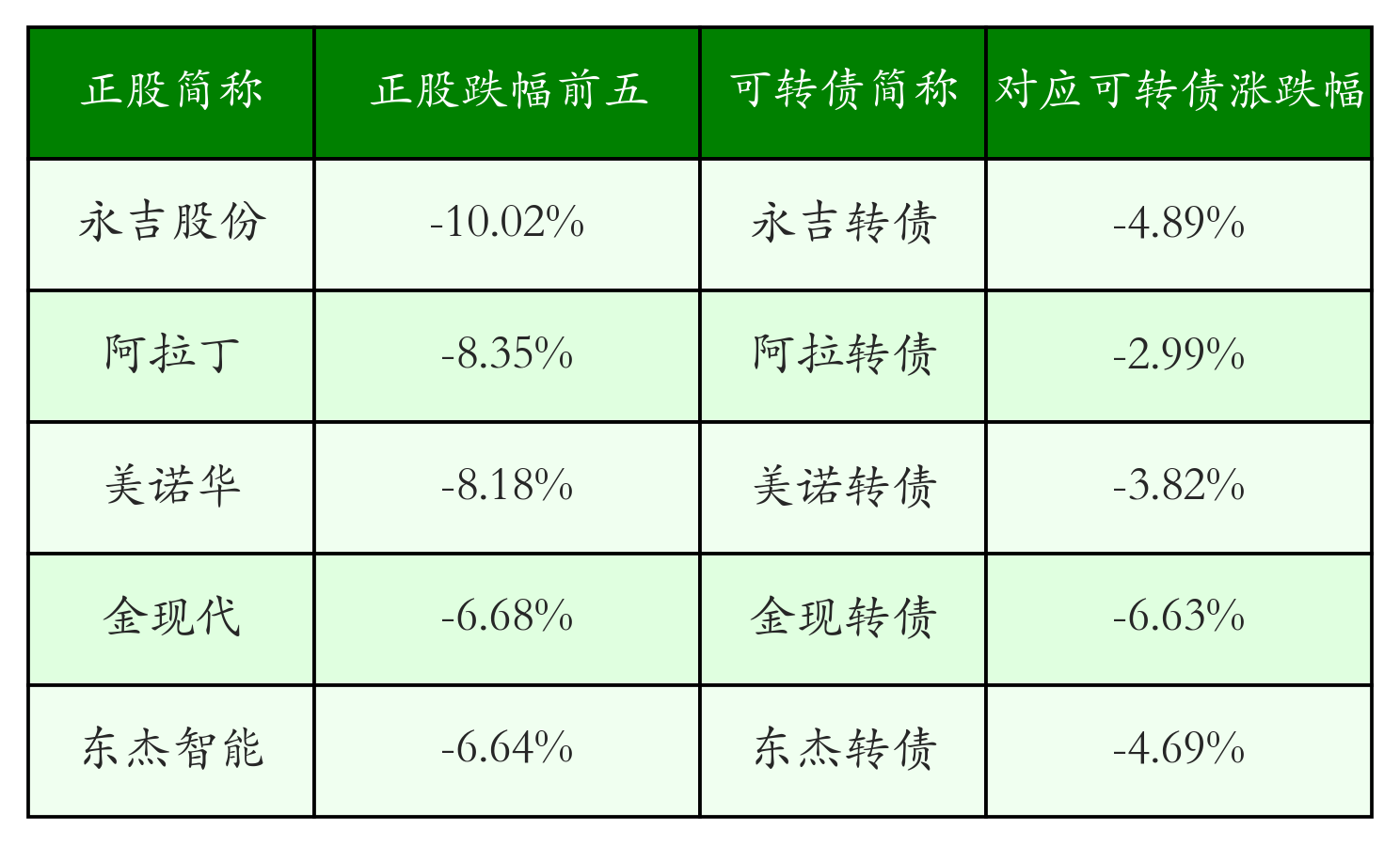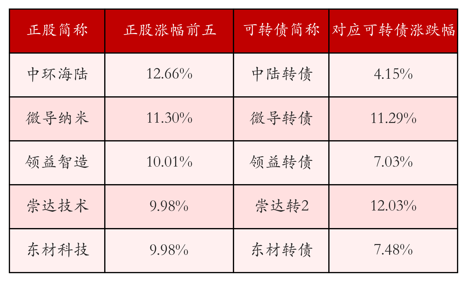 南财智讯8月28日电,南财金融终端盘后数据显示,债市方面,中证转债指数收涨0.19%,报477.84,成交额为1108.26亿元。可转债方面,今日共成交440只可转债,其中198只收涨,1只收平,241只收跌。具体来看,28只可转债涨幅超过2%。其中崇达转2(128131)涨12.03%,微导转债(118058)涨11.29%,明电转债(123087)涨8.35%。今日有25只可转债跌幅超2%,博瑞转债(118004)跌8.34%,东时转债(113575)跌7.73%,金现转债(123232)跌6.63%。存在交易量的可转债所对应的正股中,249只收涨,7只收平,184只收跌。具体来看,35只可转债对应正股涨幅超过5%,其中,领益智造(002600)涨停,收涨10.01%。同时所对应的可转债:领益转债(127107)同涨7.03%。今日有9只可转债对应正股跌幅超过5%,永吉股份(603058)跌停,收跌10.02%。同时所对应的可转债:永吉转债(113646)同跌4.89%。