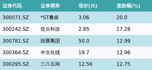 截至午间收盘,文化传媒主题涨跌幅最高的五只股票为:*ST嘉信(300071.SZ)、佳云科技(300242.SZ)、因赛集团(300781.SZ)、中文在线(300364.SZ)与三六五网(300295.SZ)。详情见下表: