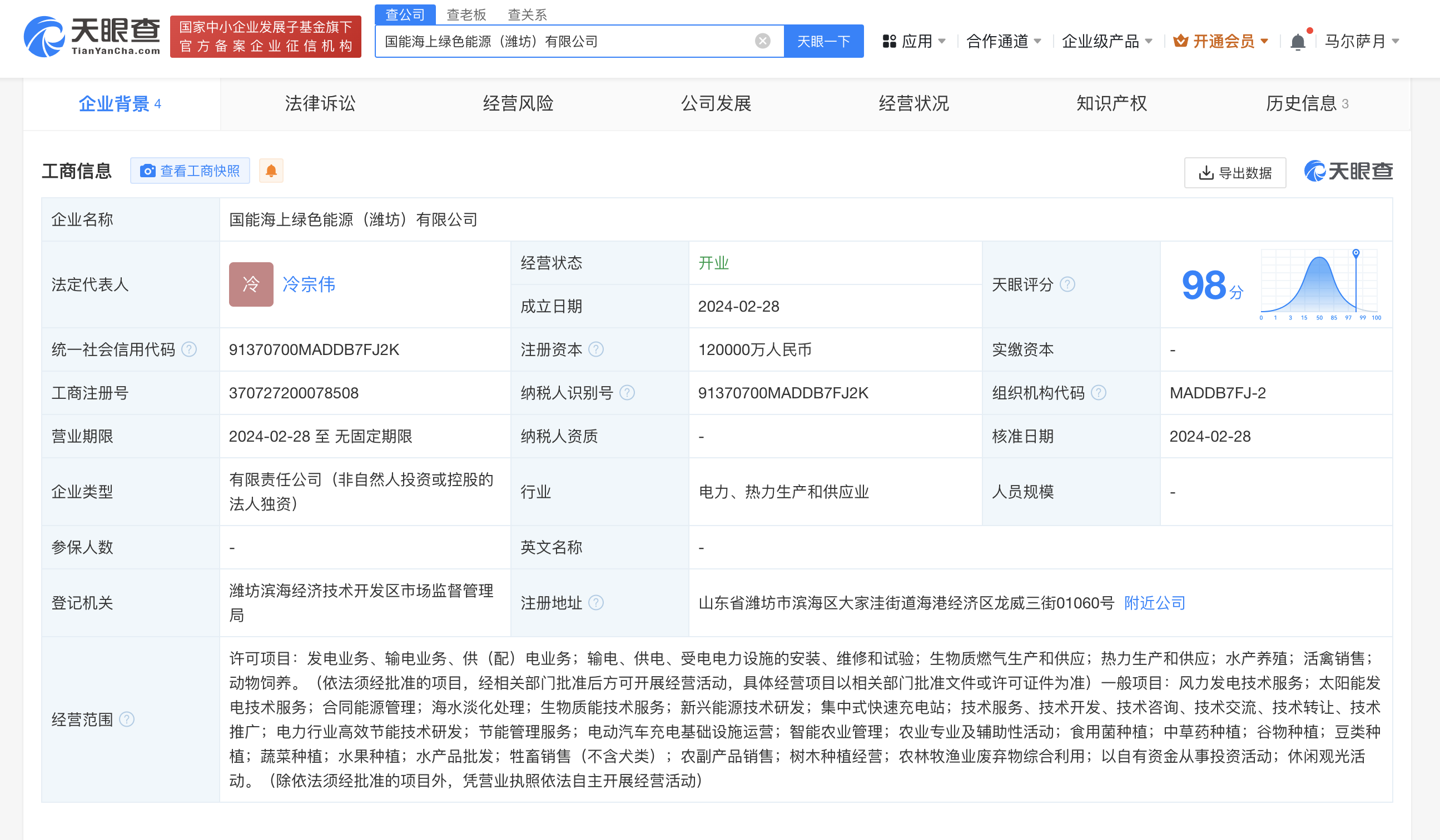 国电电力在潍坊成立海上绿能公司 注册资本12亿元
