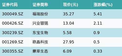 截至收盘,内蒙古主题涨跌幅最高的五只股票为:福瑞股份(300049.SZ)、兴业银锡(000426.SZ)、东宝生物(300239.SZ)、欧晶科技(001269.SZ)与蒙草生态(300355.SZ)。详情见下表: