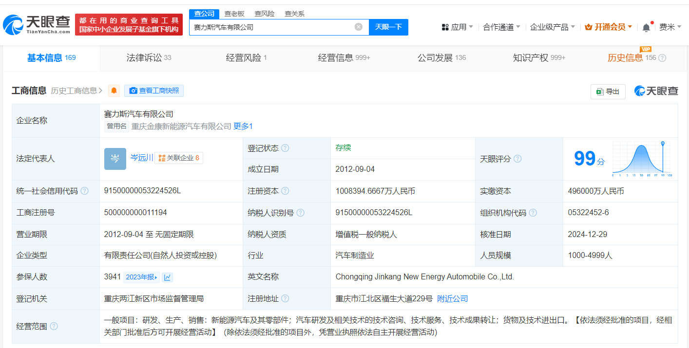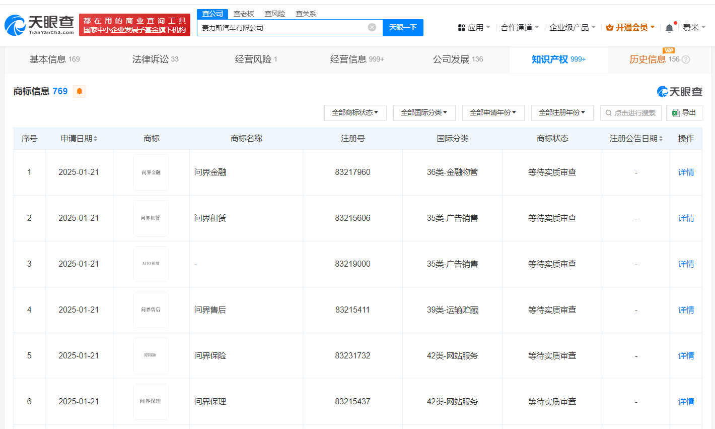 南方财经2月11日电,天眼查知识产权信息显示,近日,赛力斯汽车有限公司申请注册多枚“问界二手车”“问界金融”“问界售后”“问界二手车”“问界保险”等商标,国际分类包含金融物管、广告销售、运输贮藏等,当前商标状态均为等待实质审查。赛力斯汽车有限公司成立于2012年9月,法定代表人为岑远川,注册资本约100.8亿人民币,经营范围含汽车研发及相关技术的技术咨询、技术服务、技术成果转让等,由赛力斯(601127)、国开制造业转型升级基金(有限合伙)共同持股。