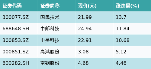 截至收盘,人工智能主题涨跌幅最高的五只股票为:国民技术(300077.SZ)、中邮科技(688648.SH)、申昊科技(300853.SZ)、高鸿股份(000851.SZ)与南钢股份(600282.SH)。详情见下表: