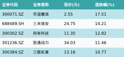 截至收盘,北京主题涨跌幅最高的五只股票为:华谊嘉信(300071.SZ)、三未信安(688489.SH)、同有科技(300302.SZ)、软通动力(301236.SZ)与三联虹普(300384.SZ)。详情见下表: