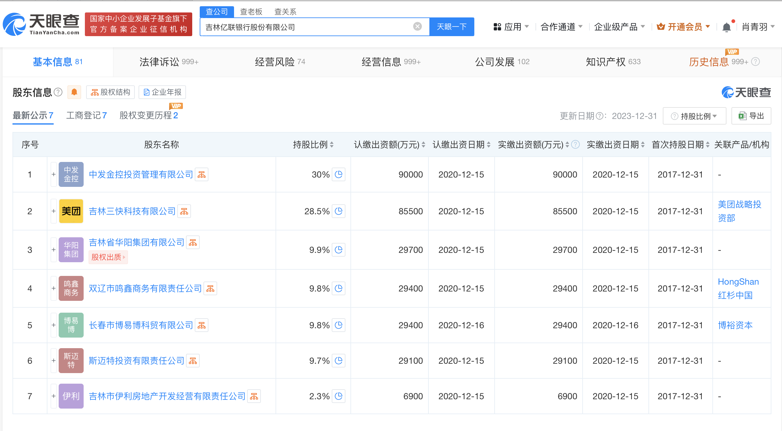 南方财经9月30日电,天眼查App显示,近日,吉林亿联银行股份有限公司发生工商变更,法定代表人由王玉海变更为蒋永军。吉林亿联银行股份有限公司成立于2017年5月,经营范围含吸收公众存款,发放短期、中期和长期贷款,办理国内外结算,办理票据承兑与贴现,发行金融债券等。股东信息显示,该公司由中发金控投资管理有限公司、吉林三快科技有限公司、吉林省华阳集团有限公司等共同持股。