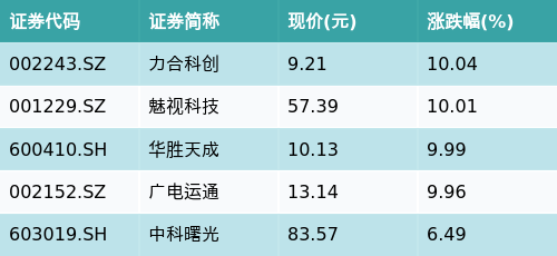 截至午间收盘,数字经济主题涨跌幅最高的五只股票为:力合科创(002243.SZ)、魅视科技(001229.SZ)、华胜天成(600410.SH)、广电运通(002152.SZ)与中科曙光(603019.SH)。详情见下表: