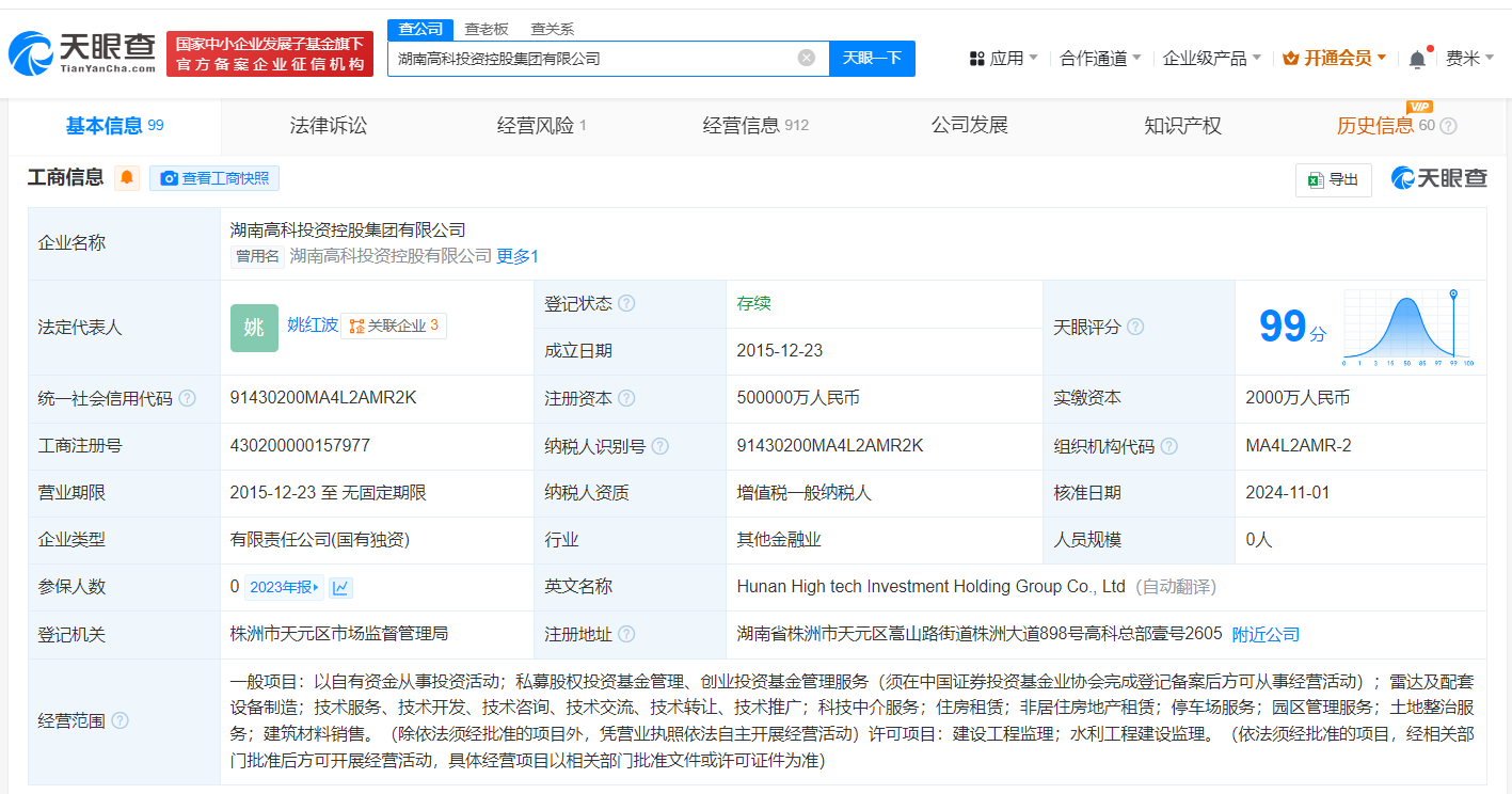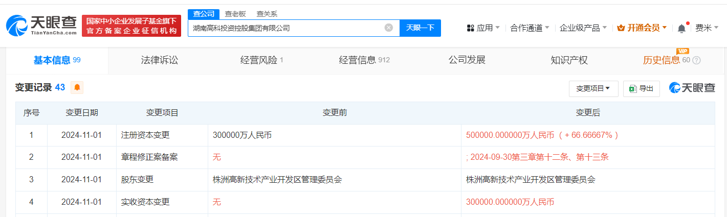 湖南高科投资控股集团增资至50亿 增幅67%