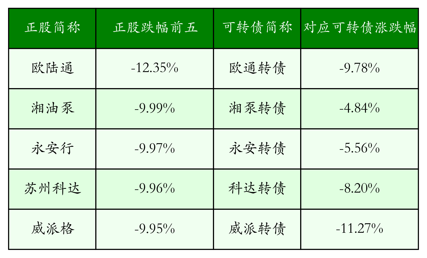 今日有11只可转债对应正股跌幅超过5%,湘油泵(603319)跌停,收跌9.99%; 永安行(603776)跌停,收跌9.97%。同时所对应的可转债:湘泵转债(113684)同跌4.84%; 永安转债(113609)同跌5.56%; 威派转债(113608)同跌11.27%; 科达转债(113569)同跌8.2%。