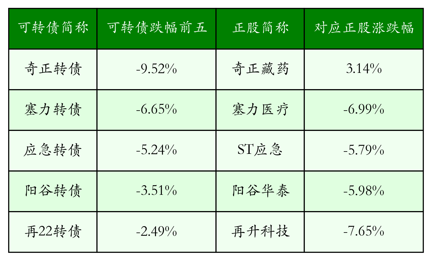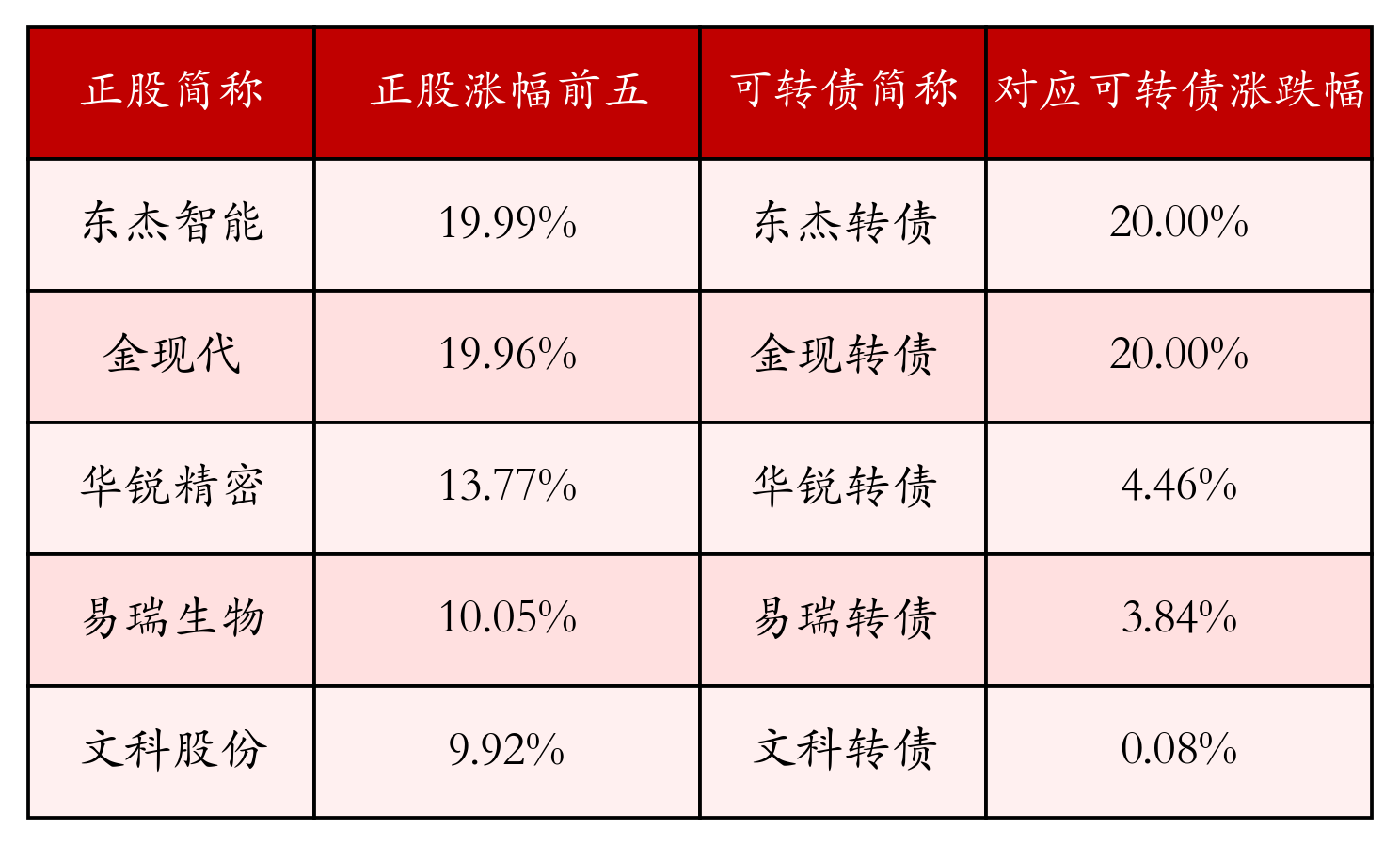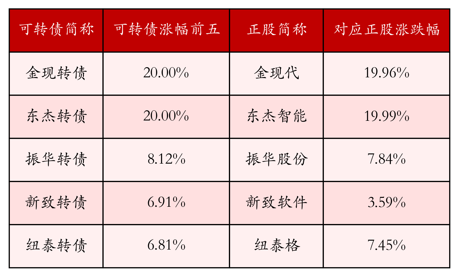 南财智讯8月4日电,南财金融终端盘后数据显示,债市方面,中证转债指数收涨0.9%,报461.34,成交额为743.42亿元。可转债方面,今日共成交460只可转债,其中422只收涨,0只收平,38只收跌。具体来看,67只可转债涨幅超过2%。其中金现转债(123232)涨20.0%,东杰转债(123162)涨20.0%,振华转债(113687)涨8.12%。今日有7只可转债跌幅超2%,奇正转债(128133)跌9.52%,塞力转债(113601)跌6.65%,应急转债(123048)跌5.24%。存在交易量的可转债所对应的正股中,328只收涨,17只收平,115只收跌。具体来看,24只可转债对应正股涨幅超过5%,其中,东杰智能(300486)涨停,收涨19.99%;金现代(300830)涨停,收涨19.96%。同时所对应的可转债:东杰转债(123162)同涨20.0%;金现转债(123232)同涨20.0%。今日有6只可转债对应正股跌幅超过5%,没有正股跌停。