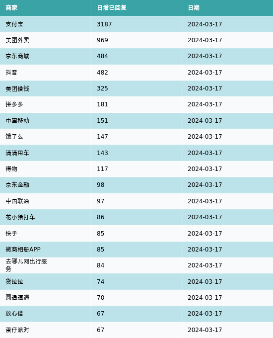黑猫投诉:支付宝、美团外卖和京东商城3月17日新增投诉回复3187起、969起和484起