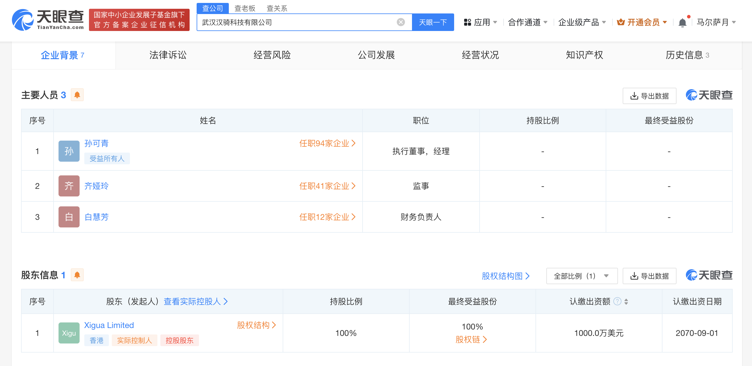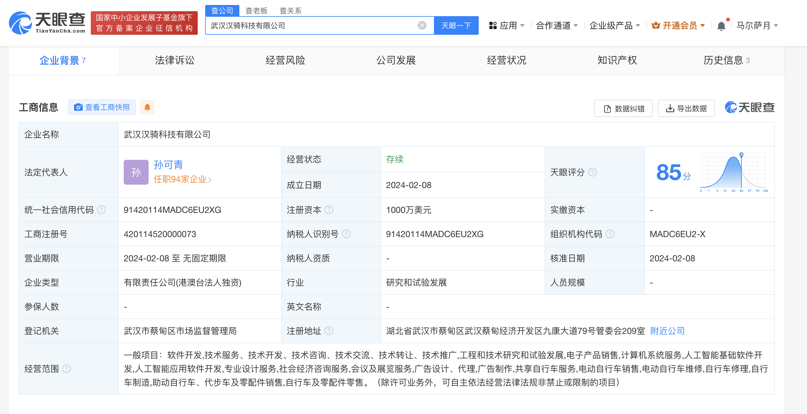 南方财经2月19日电,天眼查App显示,近日,武汉汉骑科技有限公司成立,法定代表人为孙可青,注册资本1000万美元,经营范围含工程和技术研究和试验发展、人工智能基础软件开发、共享自行车服务、电动自行车销售等。股东信息显示,该公司由美团旗下Xigua Limited全资持股。