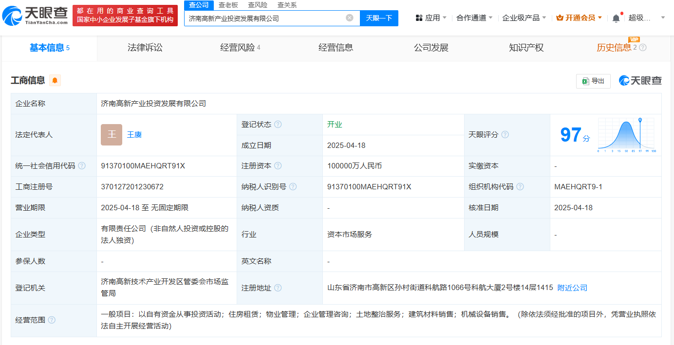 南方财经4月21日电,天眼查App显示,近日,济南高新产业投资发展有限公司成立,法定代表人为王赓,注册资本10亿人民币,经营范围包括以自有资金从事投资活动、企业管理咨询、土地整治服务等。股东信息显示,该公司由济南高新控股集团有限公司全资持股。