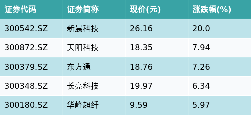 截至收盘,跨境支付(CIPS)主题涨跌幅最高的五只股票为:新晨科技(300542.SZ)、天阳科技(300872.SZ)、东方通(300379.SZ)、长亮科技(300348.SZ)与华峰超纤(300180.SZ)。详情见下表: