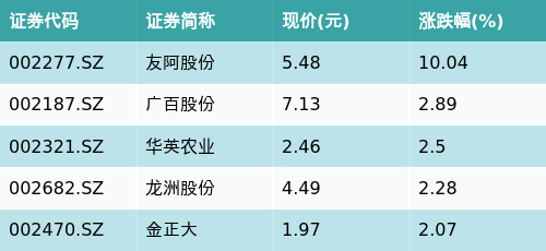 截至收盘,农村电商主题涨跌幅最高的五只股票为:友阿股份(002277.SZ)、广百股份(002187.SZ)、华英农业(002321.SZ)、龙洲股份(002682.SZ)与金正大(002470.SZ)。详情见下表: