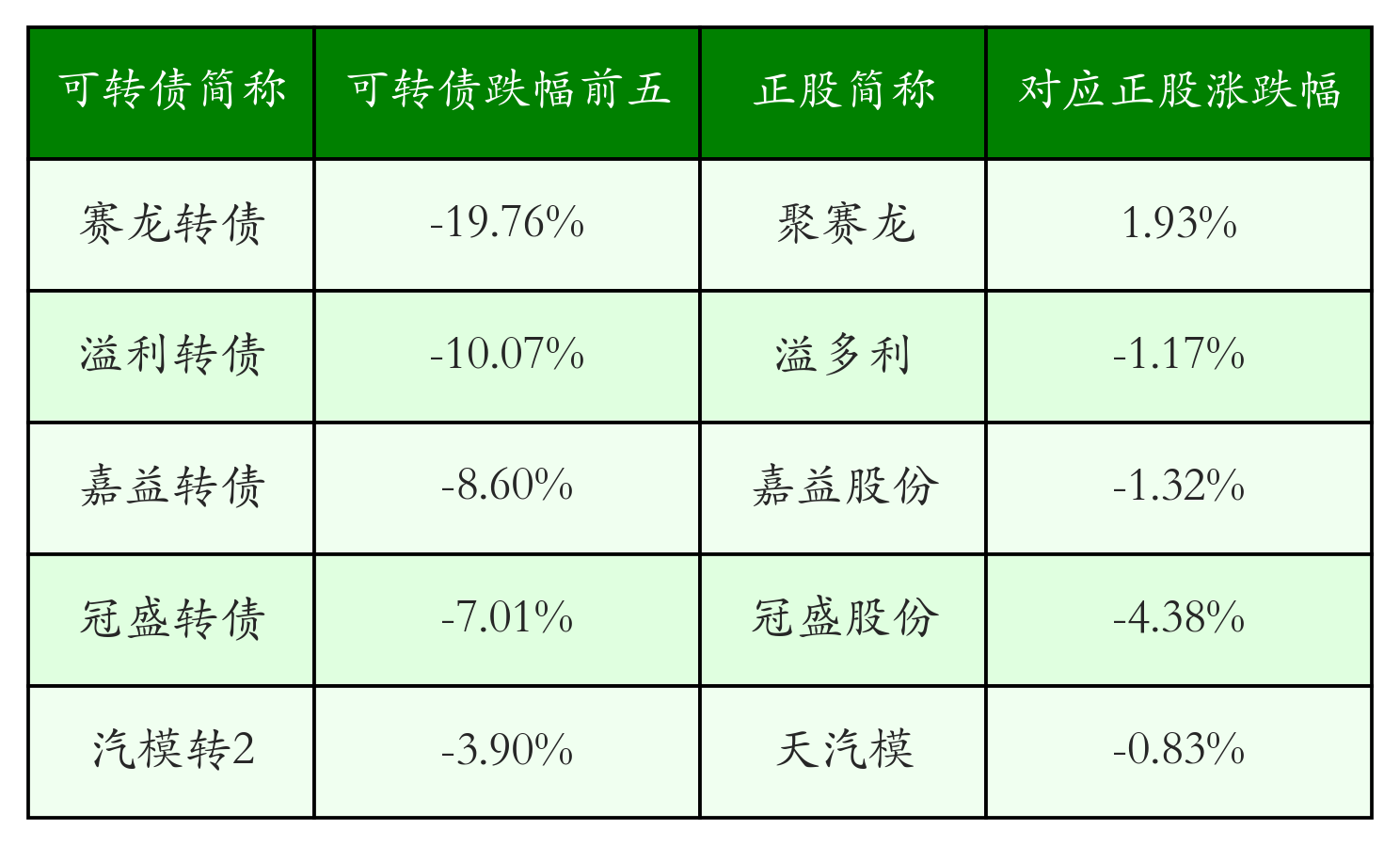 今日有9只可转债跌幅超2%,赛龙转债 (123242)跌19.76%,溢利转债 (123018)跌10.07%,嘉益转债 (123250)跌8.6%。