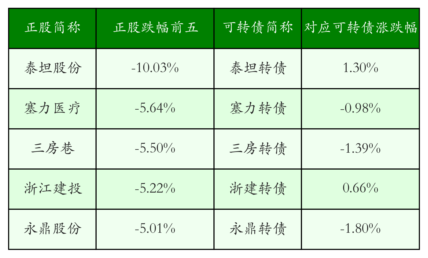 今日有5只可转债对应正股跌幅超过5%,泰坦股份(003036)跌停,收跌10.03%。同时所对应的可转债:泰坦转债(127096)反涨1.3%。