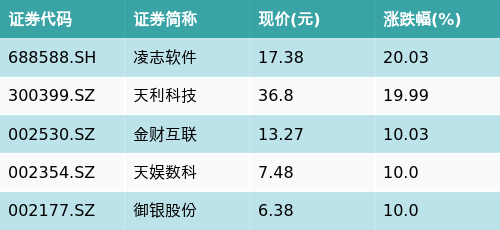截至午间收盘,互联网金融主题涨跌幅最高的五只股票为:凌志软件(688588.SH)、天利科技(300399.SZ)、金财互联(002530.SZ)、天娱数科(002354.SZ)与御银股份(002177.SZ)。详情见下表: