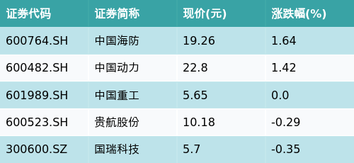 截至收盘,航母概念主题涨跌幅最高的五只股票为:中国海防(600764.SH)、中国动力(600482.SH)、中国重工(601989.SH)、贵航股份(600523.SH)与国瑞科技(300600.SZ)。详情见下表: