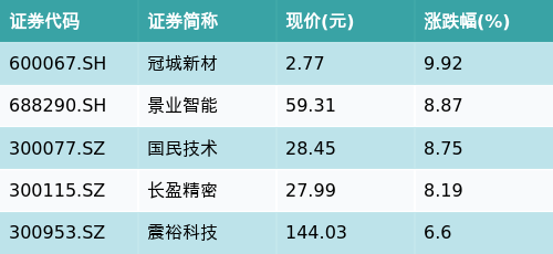截至收盘,锂电池概念主题涨跌幅最高的五只股票为:冠城新材(600067.SH)、景业智能(688290.SH)、国民技术(300077.SZ)、长盈精密(300115.SZ)与震裕科技(300953.SZ)。详情见下表: