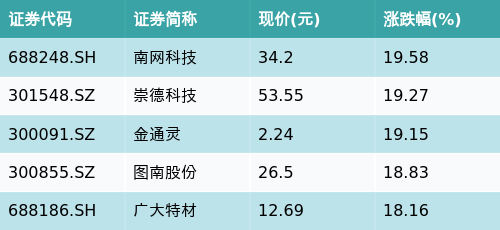 截至收盘,核电主题涨跌幅最高的五只股票为:南网科技(688248.SH)、崇德科技(301548.SZ)、金通灵(300091.SZ)、图南股份(300855.SZ)与广大特材(688186.SH)。详情见下表: