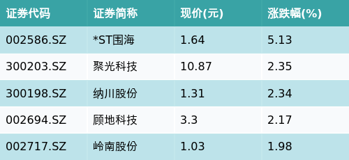 截至收盘,海绵城市主题涨跌幅最高的五只股票为:*ST围海(002586.SZ)、聚光科技(300203.SZ)、纳川股份(300198.SZ)、顾地科技(002694.SZ)与岭南股份(002717.SZ)。详情见下表: