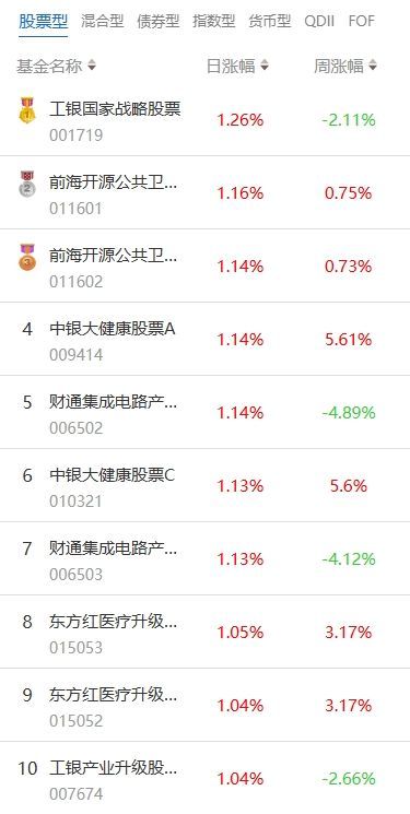 南方财经11月27日电,根据南财基金通数据:2024年11月26日当日收益靠前的股票型基金包括:工银瑞信国家战略主题股票型证券投资基金(001719,日收益1.26%);前海开源公共卫生主题精选股票型证券投资基金(011601,日收益1.16%);中银大健康股票型证券投资基金(009414,日收益1.14%)等。收益较低的股票型基金包括:嘉实智能汽车股票型证券投资基金(002168,日收益-3.38%);嘉实新能源新材料股票型证券投资基金(003985,日收益-3.32%);嘉实清洁能源股票型发起式证券投资基金(017074,日收益-3.11%)等。