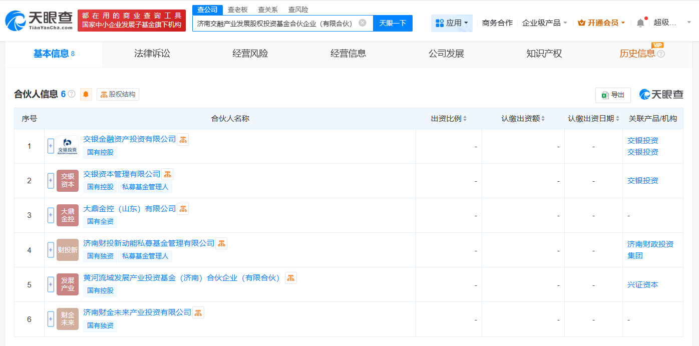 南方财经7月30日电,天眼查App显示,近日,济南交融产业发展股权投资基金合伙企业(有限合伙)成立,执行事务合伙人为交银资本管理有限公司、济南财投新动能私募基金管理有限公司,出资额10亿人民币,经营范围包括以私募基金从事股权投资、投资管理、资产管理等活动。合伙人信息显示,该基金由交银金融资产投资有限公司、济南财投新动能私募基金管理有限公司、黄河流域发展产业投资基金(济南)合伙企业(有限合伙)等共同出资。